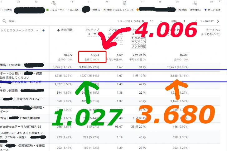 以下のGoogleアナリティクス(GA4)のスクリーンショットは、機密保持とプライバシー保護のため、活動名および拠点に関する情報はすべてマスキング(消去)処理を施している。